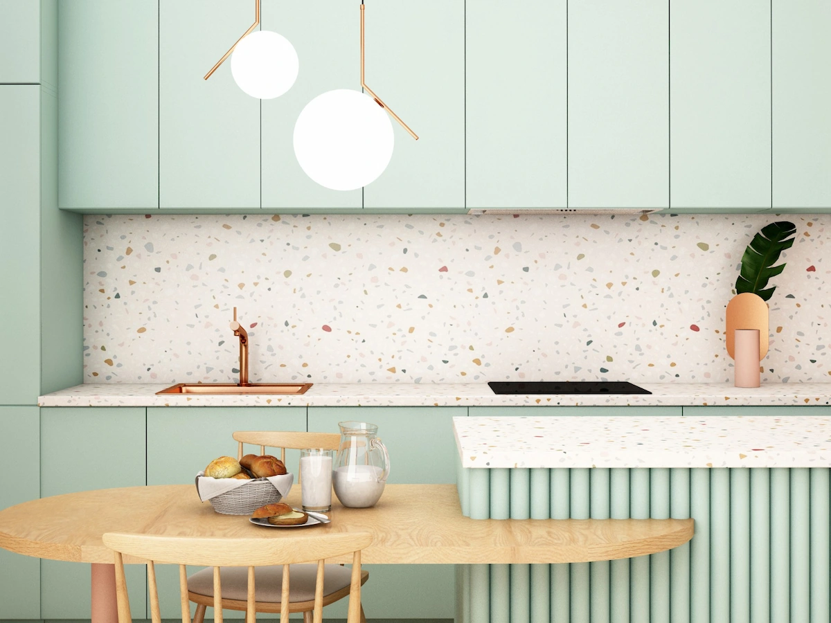 Terrazzo-patterned tiles bring a fresh and vibrant feel to your kitchen. This motif showcases a unique abstract glass-chip design, adding a stylish artistic touch.