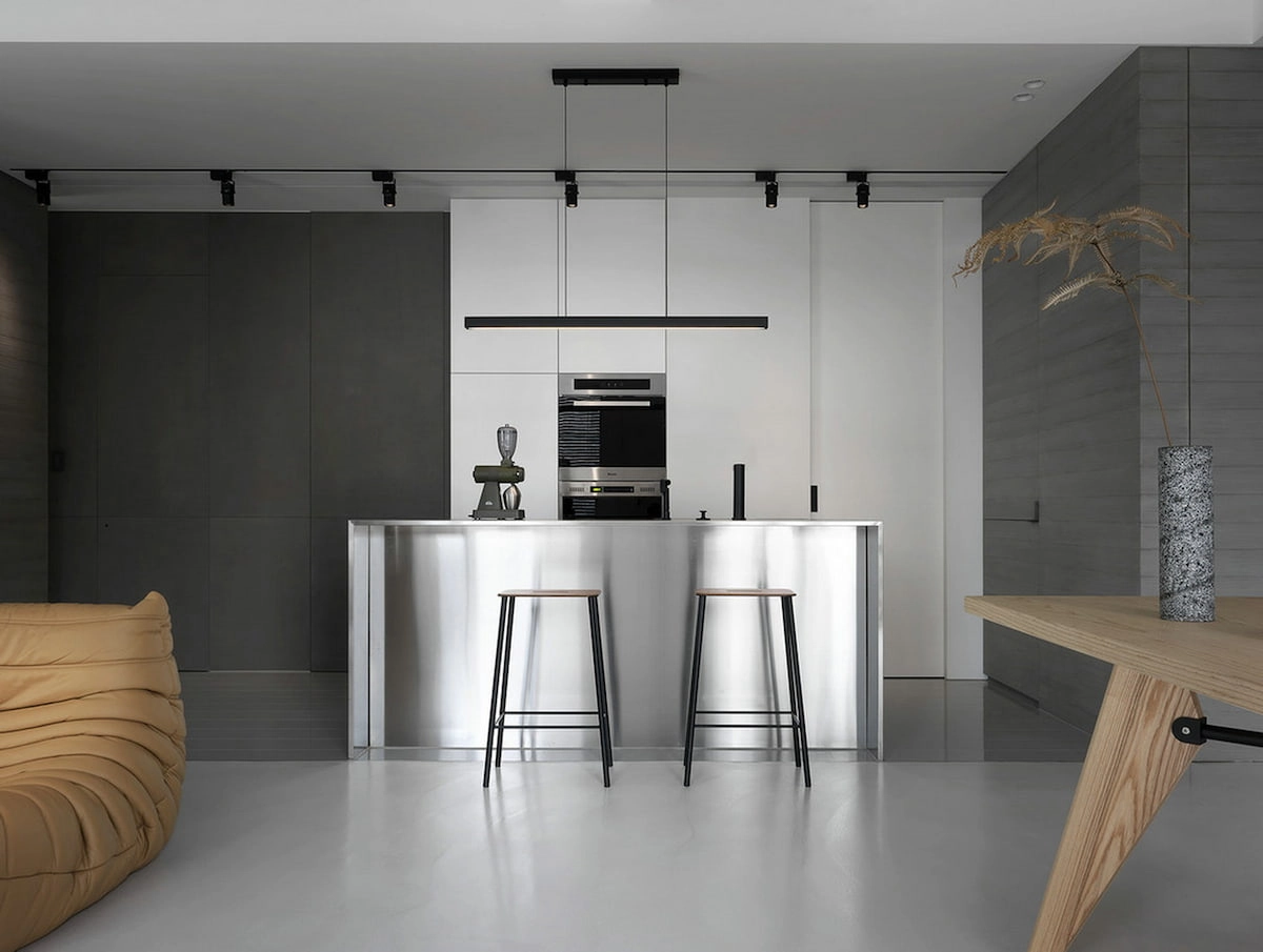 Contoh model dapur minimalis selanjutnya adalah dapur bernuansa monokrom. Desain ini mengusung perpaduan warna hitam, putih, dan abu-abu untuk menciptakan tampilan yang modern, elegan, dan berkelas.